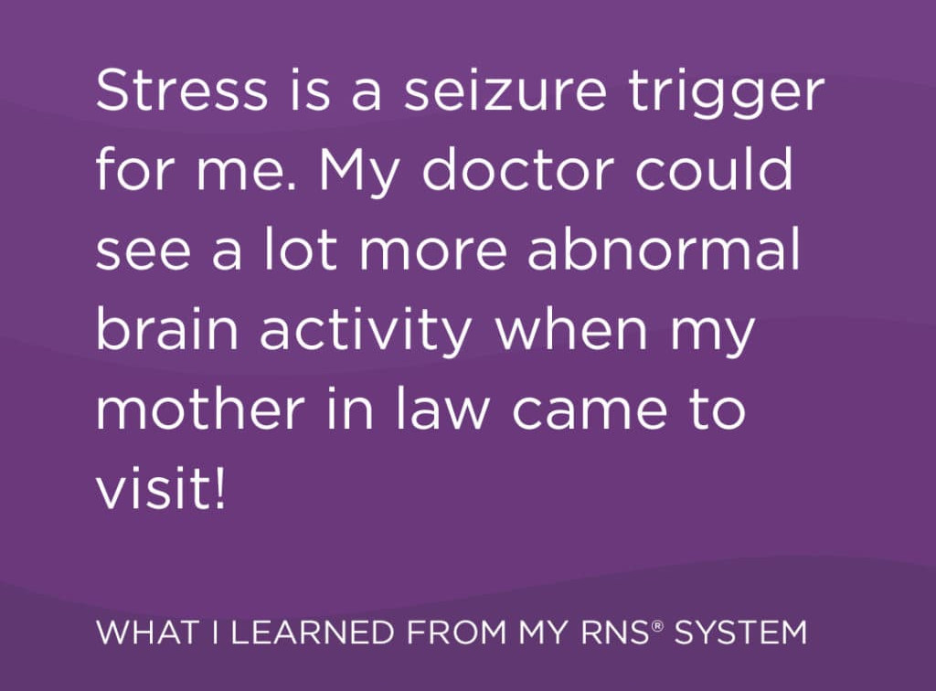 Family visits and seizuresStress is a seizure trigger for me. My doctor could see a lot more abnormal brain activity when my mother in law came to visit! -